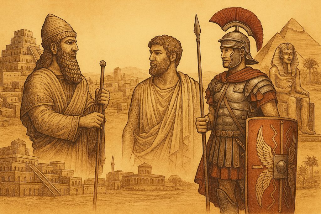 De la Mésopotamie aux légions romaines, cette page retrace la lente naissance du politique. Dans les plaines du Tigre et de l’Euphrate, les hommes inventent l’État, l’armée et la loi. La Grèce en fera une idée, Rome en fera un système. Des cités sumériennes aux empereurs, on y voit se construire le pouvoir, non comme un droit naturel, mais comme une organisation de la force, du sacré et de la raison.