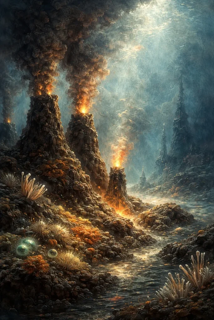 Au fond des océans, là où la croûte terrestre s’ouvre, les sources hydrothermales crachent une chaleur obscure. Ces geysers sous-marins sont le théâtre d’une alchimie primitive, une cuisine chimique de la vie. L’eau s’y charge de composés sulfurés, de métaux lourds, de molécules organiques simples. Dans les parois poreuses des cheminées, des réactions s’enclenchent : des lipides se forment, des chaînes carbonées s’assemblent, des membranes apparaissent.