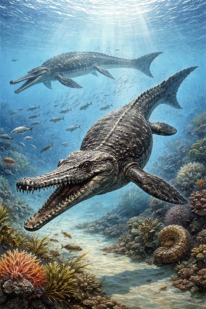 Les océans du Jurassique offrent un cadre favorable : mers chaudes, niveaux marins élevés, forte productivité biologique. Dans ce contexte, la spécialisation devient un avantage compétitif. Les thalattosuchiens exploitent efficacement leur niche, surpassant des concurrents moins adaptés à la haute mer. Ils ne sont ni marginaux ni en sursis : ils prospèrent durablement.