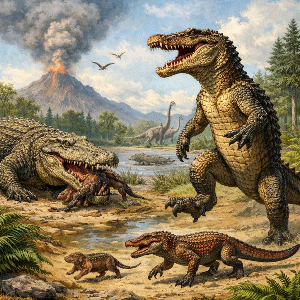 Le Trias voit apparaître les premiers crocodiliens au sens large, dans un monde profondément bouleversé par l’extinction permienne. Contrairement à l’image populaire, ces formes précoces ne sont pas définies par une vie aquatique. Beaucoup sont essentiellement terrestres, parfois élancées, dotées de membres longs et d’une posture relativement redressée. Certaines semblent adaptées à la course, ce qui tranche radicalement avec la locomotion lente associée aux crocodiles modernes.