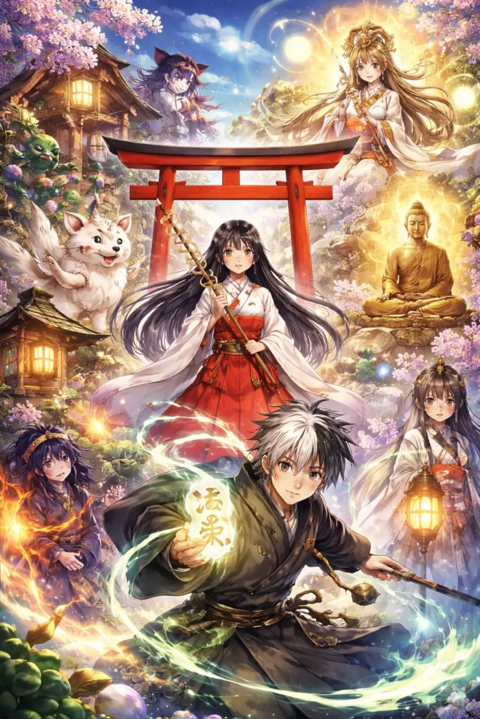 Le shintô est sans doute la matrice la plus utilisée. Il structure visuellement nombre de récits : les torii rouges, les sanctuaires boisés, les jeunes prêtresses en tenue rituelle, les rites de purification, les kami multiples qui peuplent l’arrière-plan du quotidien. Mais ces éléments sont rarement traités comme relevant d’une croyance. Ils servent de langage d’ancrage culturel, une manière de dire « ceci est japonais », plus qu’une porte d’accès au sacré.