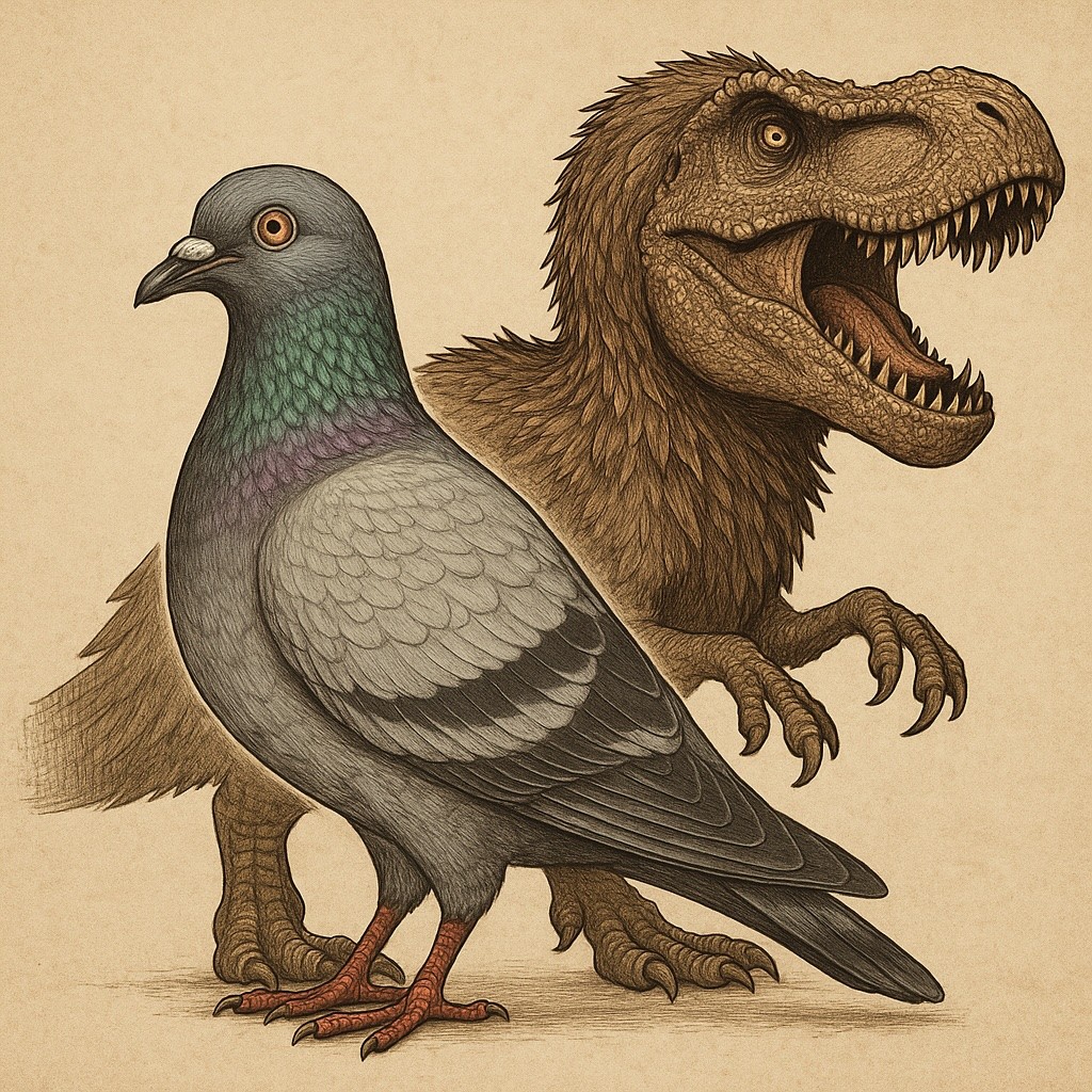 Prenez un pigeon : son squelette, son bassin, sa clavicule en forme de fourchette (le fameux furcula), ses poumons à sacs aériens, tout crie « dinosaure ». Il possède même les mouvements de marche typiques des théropodes. Quand il tourne la tête avec des gestes secs, c’est un geste hérité de ses ancêtres reptiliens. Même la structure de ses écailles sur les pattes trahit cette origine.