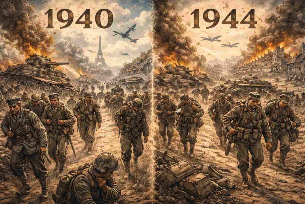 Il est temps de regarder les faits en face : 1944 est le miroir exact de 1940. Des fronts percés, des généraux incapables, et une armée en déroute. L’histoire n’a retenu qu’une seule honte, mais la réalité, c’est que les deux armées ont fini dans la même boue. Si 1940 est le symbole de la chute française, 1944 devrait être celui de l’imposture militaire allemande. Deux effondrements, deux déroutes, une seule vérité : quand le front craque et que la tête ne suit plus, le reste n’est qu’une fuite en avant vers le désastre.
