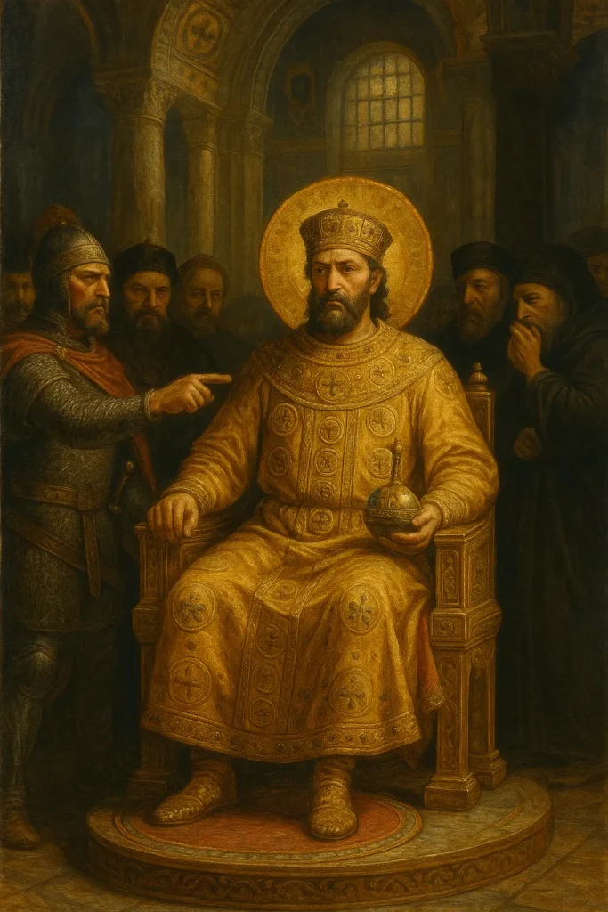 Pour compenser cette fragilité, Byzance entoure le Basileus d’un appareil de sacralité sans équivalent. Le couronnement à Sainte-Sophie fait de l’empereur un élu de Dieu ; les cérémonies impériales reproduisent la liturgie céleste, et les mosaïques le représentent auréolé comme un saint. Pourtant, derrière cette théologie du pouvoir, l’épée continue de trancher la vérité. Le Basileus est le représentant du Christ sur terre, mais il reste à la merci de ses généraux, de ses eunuques et de ses gardes. La moindre rumeur de faiblesse suffit à déclencher un coup d’État. L’armée, gardienne du trône, en devient la première menace. À Constantinople, la foi ne remplace pas la force : elle la déguise. La majesté impériale repose sur le miracle quotidien d’un pouvoir que tout le monde convoite, mais que personne ne peut stabiliser.