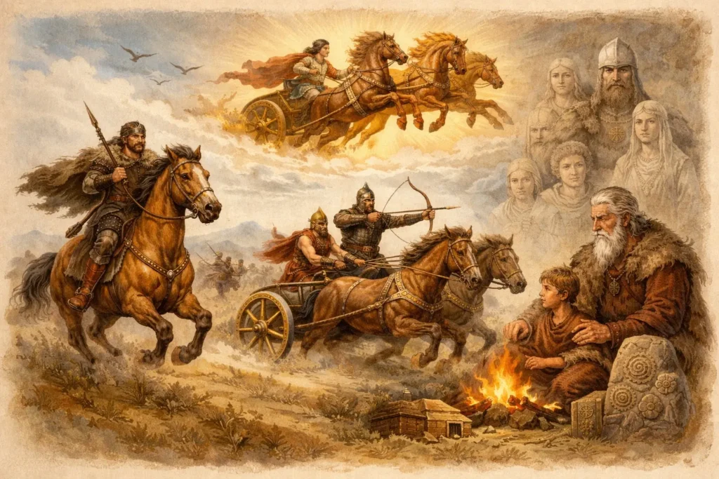 Cette centralité n’est pas abstraite. Elle se lit dans les tombes, où des chevaux sont parfois enterrés aux côtés des chefs. Elle se lit aussi dans les mythes, où le cheval solaire parcourt le ciel, où les héros sont élevés avec des juments, où la royauté s’affirme par un rite équestre. Le cheval n’est pas décoratif, il est structurant.