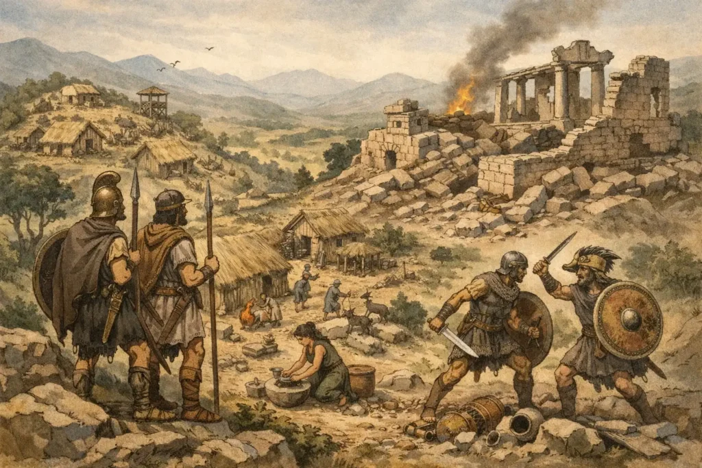 L’Âge obscur grec, qui s’étend approximativement du XIIe au IXe siècle av. J.-C., est souvent décrit comme une parenthèse de régression entre l’éclat mycénien et l’essor archaïque. Cette lecture repose sur une comparaison trompeuse : moins de villes, moins d’écriture, moins de sources, donc moins d’histoire. Or, ce temps n’est pas un simple vide. Il correspond à une recomposition profonde des formes d’habitat, du pouvoir et du territoire. Loin de préparer mécaniquement la polis par continuité urbaine, la Grèce connaît d’abord une ruralisation durable, marquée par la dispersion et l’instabilité. La cité ne naît pas comme idéal politique, mais comme réponse pragmatique à ce monde fragmenté.