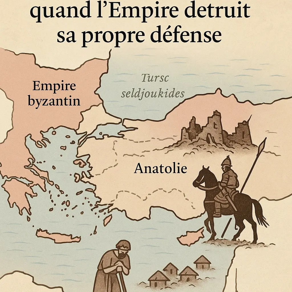 Lorsque les Seldjoukides entrent en Anatolie au XIᵉ siècle, ils ne trouvent plus les anciens thèmes solidement tenus par des cavaliers enracinés. Ils traversent des provinces vides de leur structure militaire traditionnelle. Après Mantzikert en 1071, ce n’est pas une armée qui s’effondre, mais un système entier. Les élites ont disparu, les paysans-soldats sont ruinés, les thèmes sont divisés, la conscription locale est morte. L’Empire perd son bouclier.