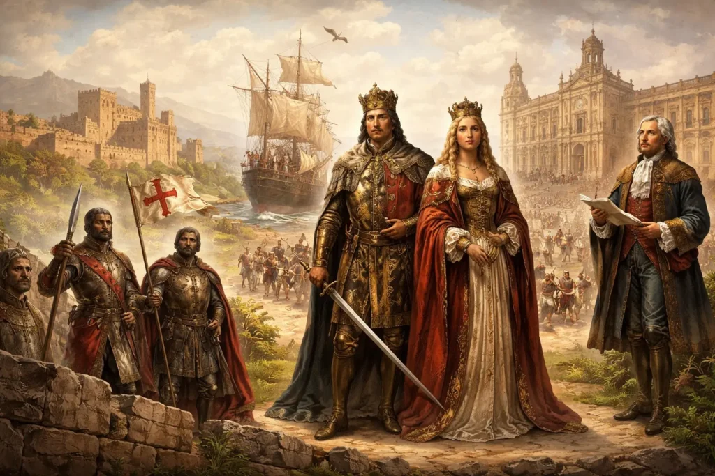 L’origine de l’Espagne à l’époque moderne continue d’être présentée de manière trompeuse. Dans les récits scolaires comme dans une partie de la vulgarisation historique, la naissance de l’Espagne serait acquise dès la fin du XVe siècle, par le mariage d’Isabelle de Castille et de Ferdinand d’Aragon, puis par la chute de Grenade en 1492. Cette lecture confond union dynastique, victoire militaire et construction étatique. Or, l’Espagne moderne ne naît ni d’un mariage ni d’un acte fondateur unique. Elle s’enracine dans une longue dynamique de reconquête et de domination religieuse, tandis que l’État espagnol, au sens strict, n’émerge que très tardivement, au tournant du XVIIIe siècle.