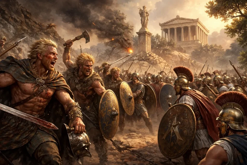 Cette irruption est d’autant plus troublante qu’elle ne correspond à aucune menace anticipée. Les Gaulois ne figurent pas dans les calculs stratégiques grecs, ni dans leurs horizons politiques habituels. Ils ne sont ni des rivaux internes, ni un empire extérieur connu. La rencontre se fait donc sans préparation mentale, dans un espace que les Grecs pensaient stabilisé par l’histoire, les alliances et la mémoire des guerres passées.