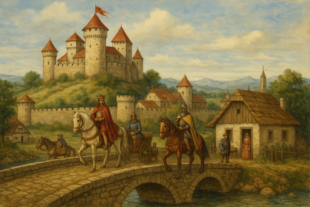 Sous le règne de Géza puis surtout de son fils Étienne Ier, la Hongrie se transforme en royaume chrétien reconnu par Rome. Couronné en l’an 1000 avec une couronne envoyée par le pape, Étienne fonde un État structuré autour du catholicisme et d’une administration centralisée. Les anciennes tribus sont converties par la force ou la persuasion, et le pouvoir royal s’impose sur les chefs de clan. La Hongrie cesse d’être un monde périphérique : elle devient un acteur de la politique européenne.