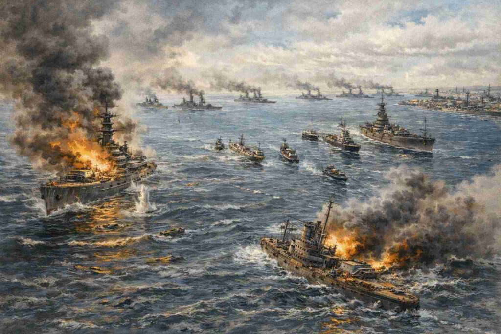Les combats s’engagent à très longue distance, mettant à l’épreuve la précision des tirs et la résistance des blindages. Si la technologie allemande et l’entraînement des équipages s’avèrent redoutables, la masse britannique encaisse les coups. À l’issue de l’engagement, la Royal Navy perd 14 unités et 6 000 hommes, tandis que l’Allemagne perd 11 navires et 2 500 marins. Ces chiffres alimentent immédiatement la thèse d’une victoire tactique allemande, mais ils occultent la réalité des capacités de remplacement : la Grande-Bretagne peut reconstruire sa flotte, l’Allemagne ne le peut plus.