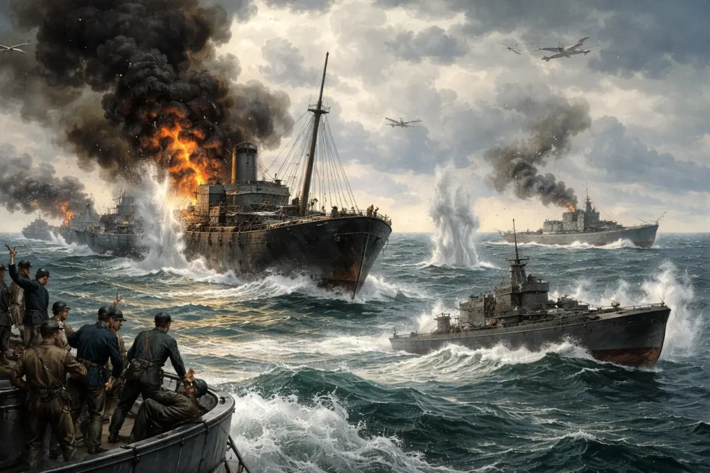 La guerre de l’Atlantique prend la forme d’un conflit diffus et invisible. Les navires marchands, souvent isolés, deviennent les cibles prioritaires. Les routes commerciales sont attaquées sans relâche. Il ne s’agit pas de conquérir des territoires, mais de désorganiser les flux. Chaque navire coulé affaiblit un peu plus la capacité du Royaume-Uni à nourrir sa population et à soutenir son effort de guerre.