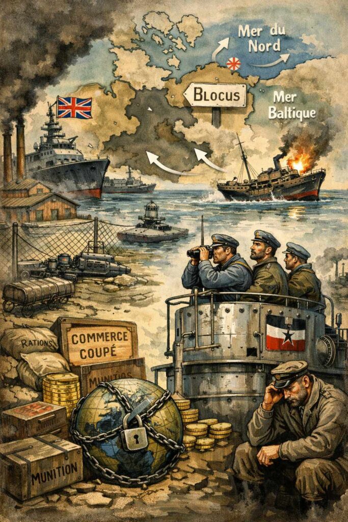 La mer Baltique est une mer quasi fermée, dominée par des détroits contrôlés. L’accès à la mer du Nord est étroit, facilement bloquable, et immédiatement sous la menace britannique. Dès les premiers mois de la guerre, le blocus maritime impose une réalité brutale : l’Allemagne est exclue du commerce international. Matières premières, denrées alimentaires, flux financiers, tout est interrompu ou sévèrement limité.