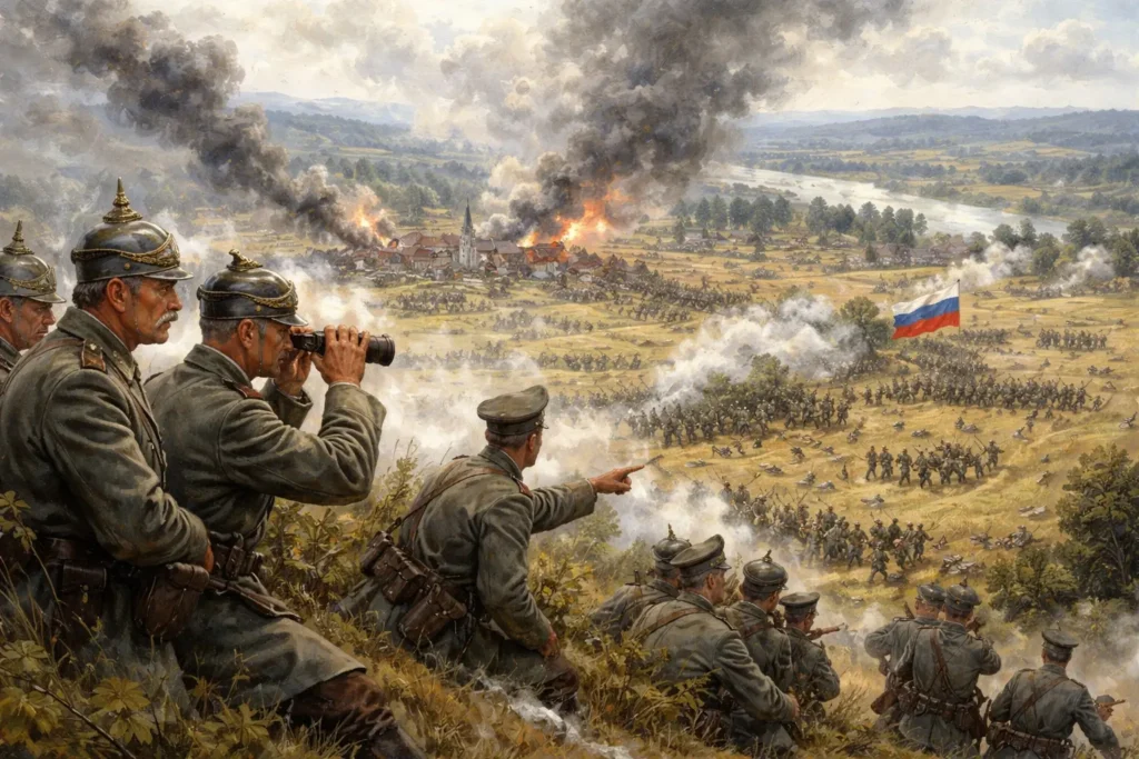 Face à la 8e armée allemande avancent deux armées russes, numériquement supérieures. En cas d’échec allemand, aucune ligne intermédiaire solide n’existe avant la Vistule. La profondeur stratégique allemande à l’Est est courte, concrète, mesurable. Ce n’est pas une abstraction cartographique, mais une réalité opérationnelle.