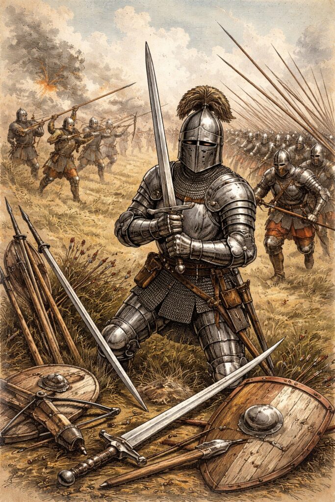 L’arc long anglais, l’arbalète génoise, puis les premières armes à feu transforment le champ de bataille. La capacité à infliger des pertes à distance devient déterminante. L’épée, arme de contact rapproché, arrive trop tard dans la séquence tactique.