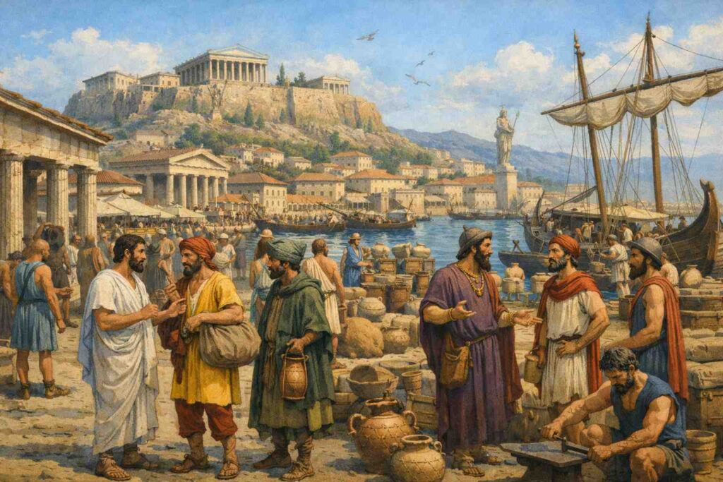 À Athènes, beaucoup de métèques travaillent dans les ateliers, les chantiers ou les métiers du métal et de la céramique. D’autres sont commerçants ou banquiers. Leur expérience et leurs réseaux leur permettent d’occuper une place importante dans les échanges méditerranéens.