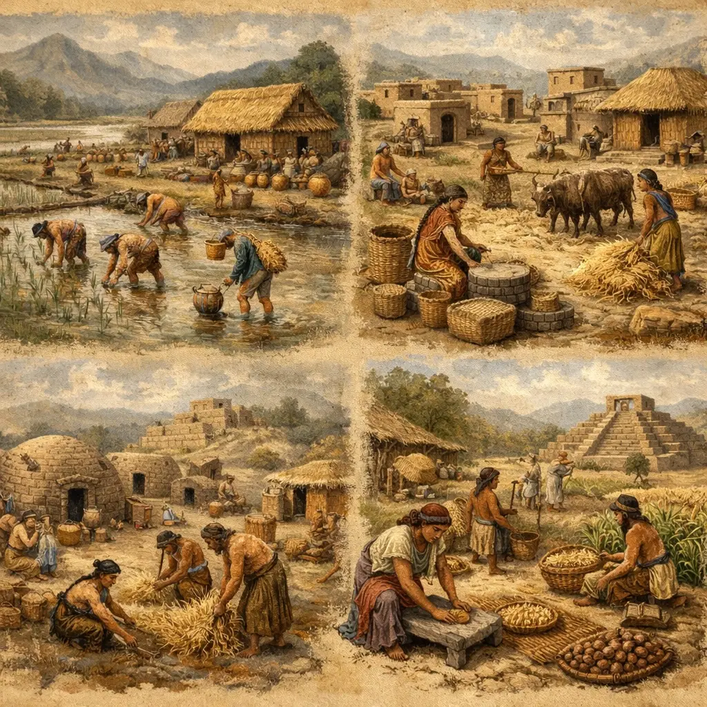 En Mésoamérique comme dans les Andes, les sociétés développent progressivement des formes de fixation autour de plantes domestiquées telles que le maïs, la courge ou la pomme de terre. Les villages émergent après de longues phases de semi-sédentarité, marquées par le stockage, la transformation des paysages et la territorialisation.