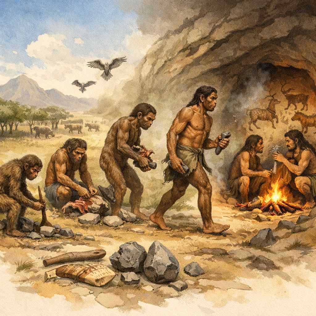 L’histoire humaine commence donc non pas par une rupture biologique nette, mais par une mutation lente et cumulative, où la technique, l’écologie et la sélection naturelle transforment progressivement un primate en être humain.