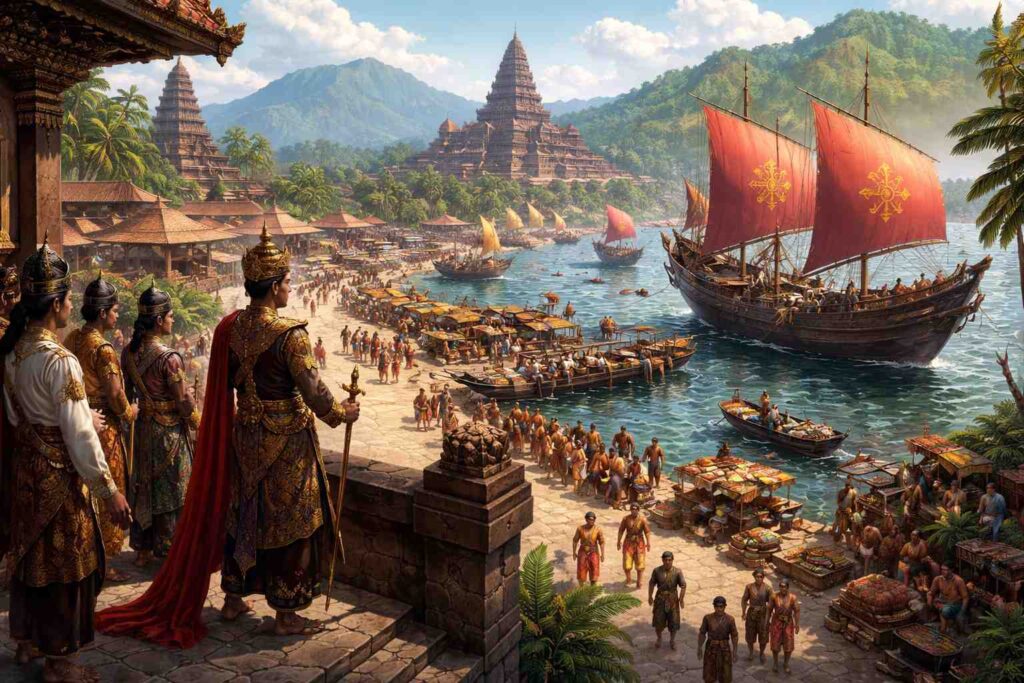 Cette logique fait de l’empire une puissance des détroits plutôt qu’une puissance des plaines. Là où d’autres construisent leur domination sur la continuité territoriale, Majapahit la fonde sur la régulation des passages et des escales.