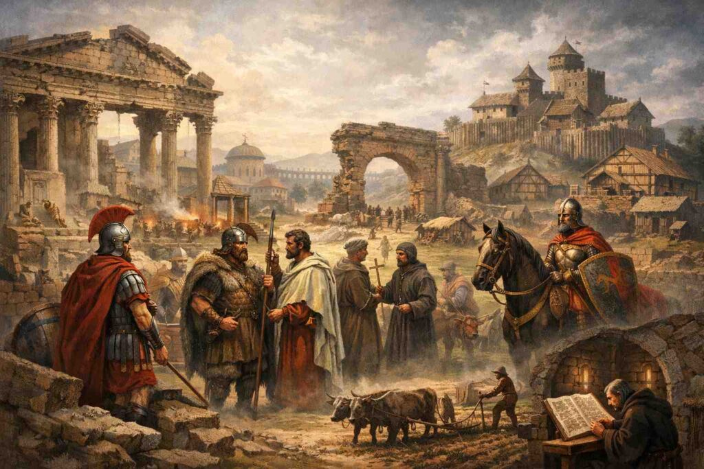 Le monde romain n’est pas totalement effacé, mais il cesse d’être le système dominant qui structurait l’espace méditerranéen. L’Europe occidentale entre alors dans une phase de recomposition politique et sociale.