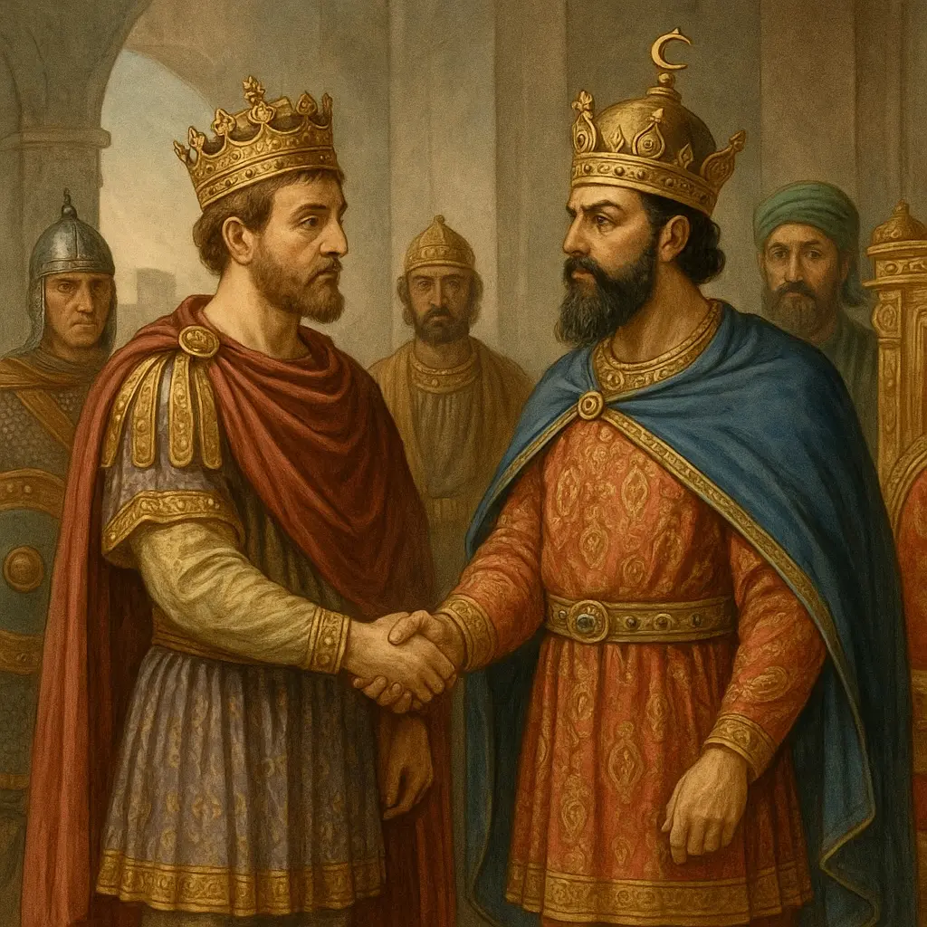 En 591, Chosroès II, renversé par une révolte interne, est restauré sur le trône perse grâce à l’aide militaire directe de l’empereur byzantin Maurice. Ce soutien ne donne pas seulement lieu à un traité : il fonde une relation personnelle entre deux souverains légitimes, basée sur l’honneur, la reconnaissance et l’obligation mutuelle. Chosroès ne doit pas simplement un avantage diplomatique à Byzance, il doit son trône à Maurice.