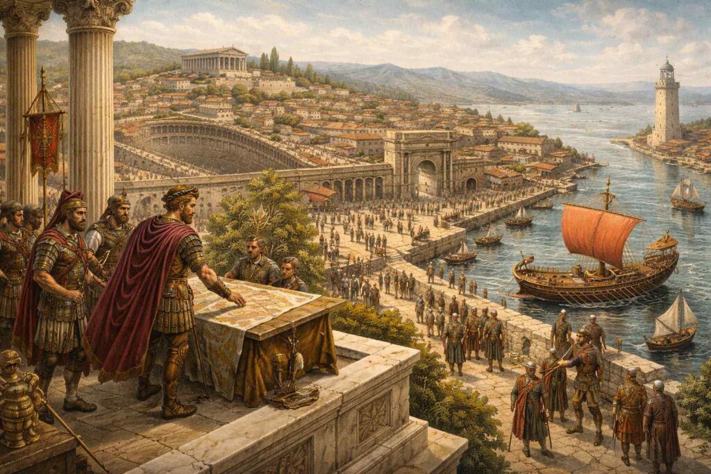 Ce système n’est pas hiérarchique, mais distribué. Chaque ville remplit une fonction spécifique, intégrée à un même espace de gouvernement. Le pouvoir impérial occidental n’est plus concentré en un point unique, mais organisé en réseau autour des nécessités de la guerre.