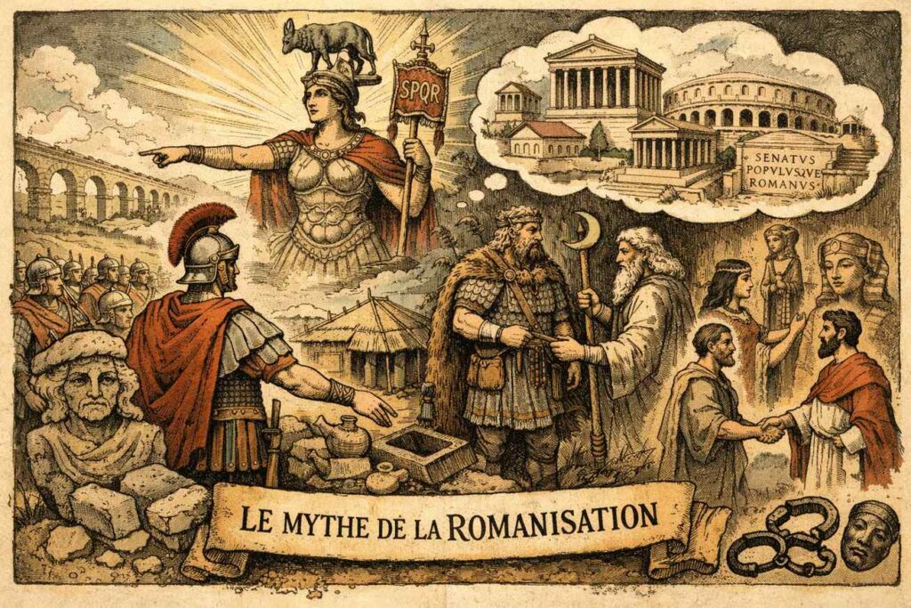 La romanisation, telle qu’elle est souvent présentée, est un artefact historiographique. Elle projette sur l’Antiquité des catégories modernes, transforme des stratégies locales en politique impériale et confond façade culturelle et transformation sociale. Déconstruire cette romanisation fantasmée, ce n’est pas affaiblir l’histoire romaine ; c’est au contraire lui rendre sa complexité, ses tensions, et sa réalité profondément politique.