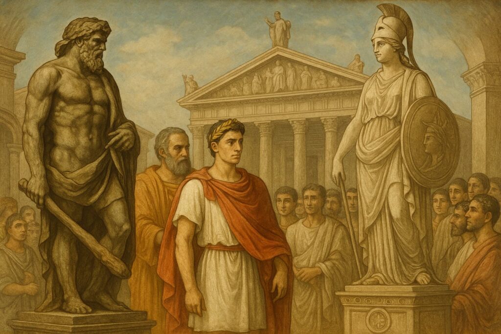 Ainsi, dès ses origines, Rome ne pense pas son autorité dans un vide latin, mais dans un cadre culturel grec déjà structuré : le pouvoir comme équilibre entre la force, la sagesse et la piété.