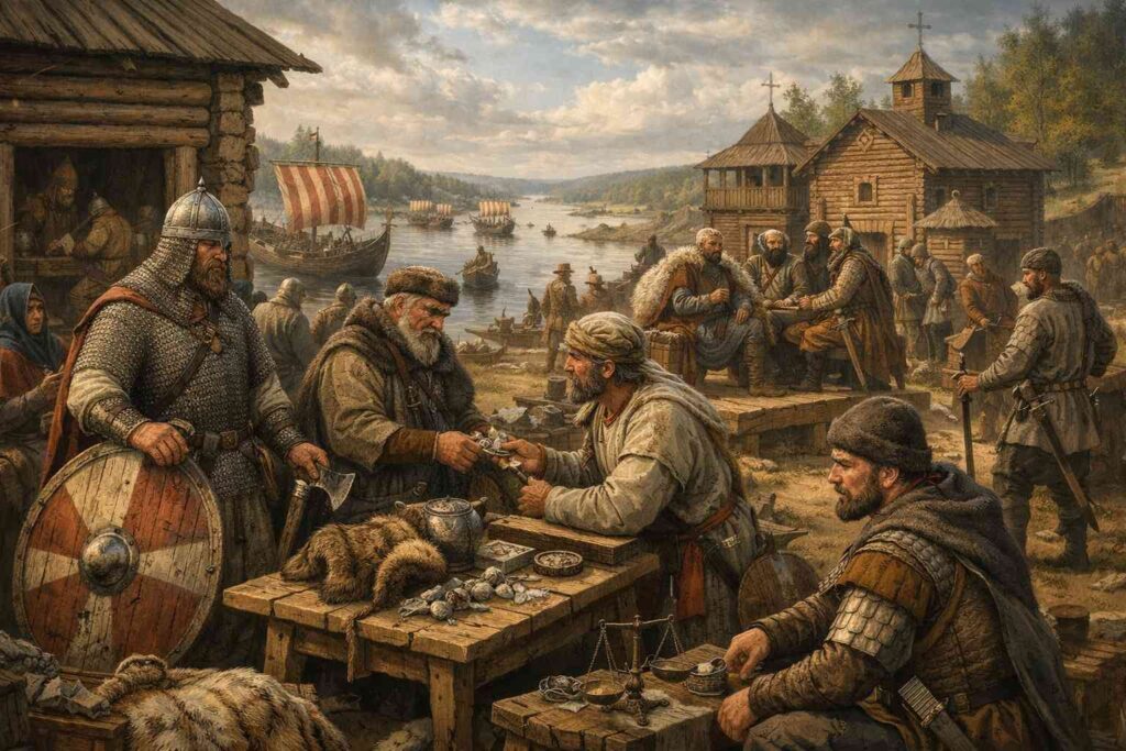 Les Varègues n’entrent pas dans le monde rus’ pour le gouverner. Ils y entrent parce que leur circulation les y contraint. Ce monde ne les absorbe pas totalement, mais il les transforme. À force de passages, ils cessent d’être de simples silhouettes mobiles et deviennent des acteurs identifiables, pris dans des réseaux de relations, de contraintes et d’obligations.