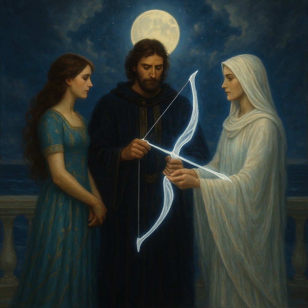 Le Lugal prit l’arc avec lenteur. Lorsqu’il toucha la corde, une onde glacée remonta jusqu’à son cœur. La mer se tut, le ciel pâlit, et les étoiles parurent vaciller. Autour d’eux, les prêtresses d’Océanie s’inclinèrent. Luméara s’illumina faiblement entre les mains de Thalassindra, et la mer projeta un dernier éclat sur les visages des trois souverains.