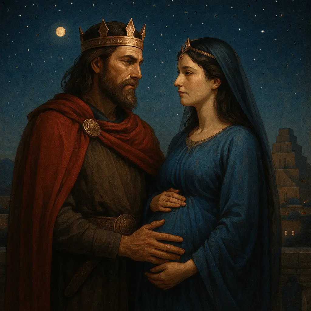 La nuit s’ouvrait comme une paupière lasse sur Kadingirra-Ming. Au bord des terrasses, les lampes de jasmin brûlaient bas, et la ville retenait son souffle. Ansugaisos, qu’on nommait dans les cérémonies Lugal-Wanax Anšerim-Gal, entra sans escorte dans le jardin des astres. Kadingirra-Saphira l’y attendait, drapée d’un voile couleur d’aube. Il posa la main sur la pierre tiède, elle posa la sienne sur la sienne : leurs regards se trouvèrent comme deux flèches venues de très loin, encore vibrantes d’un même trajet. Aucune trompette ne salua leurs pas ; seules les feuilles, dans le vent très doux, disaient qu’un roi retrouvait son foyer.