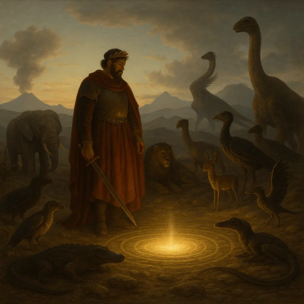 Le silence du désert s’étendait encore lorsque Ansugaisos reprit sa marche. Le sable, noirci par la cendre du combat, collait à ses pas comme une poussière de mort. Mais derrière lui, les vents tournaient, et les plaines se couvraient d’ombres mouvantes. D’abord, il crut à un mirage, puis il comprit : les animaux venaient à lui. D’énormes silhouettes se dessinaient dans la lumière rouge du soir : mammouths d’Afrique, éléphants géants aux défenses torses, léopards antiques, lions aux crinières sombres, et même des créatures qu’aucun humain n’avait jamais vues — reptiles cuirassés, oiseaux aux ailes d’écailles, brontosaures des savanes profondes. Ils avançaient lentement, sans peur, formant une procession silencieuse.