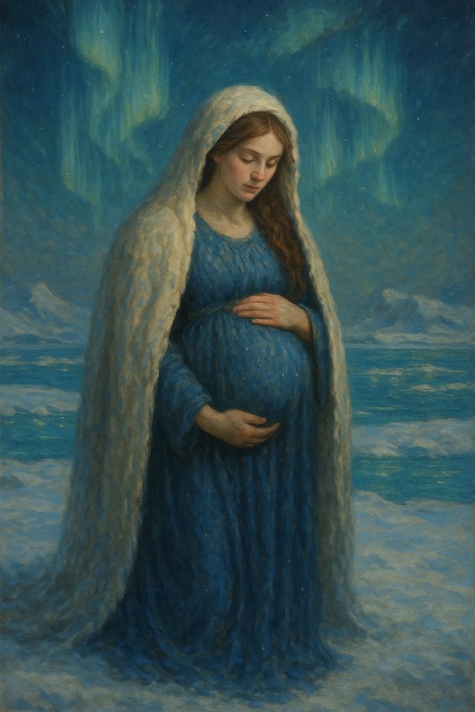 Elle ne posa pas de question. Elle accueillit simplement cette lumière dans son souffle, comme on recueille la neige avant qu’elle fonde. L’air se fit plus limpide, la mer plus lente, et dans le ventre de la Reine s’inscrivit la promesse d’un enfant — fruit d’un mystère, non d’un désir. Nul n’osa prononcer de prophétie. Les phoques dressèrent leurs têtes, les oiseaux tournoyèrent trois fois, et l’océan, loin sous la glace, murmura un chant d’apaisement. Ainsi commença la gestation du dernier miracle de l’Âge d’or.