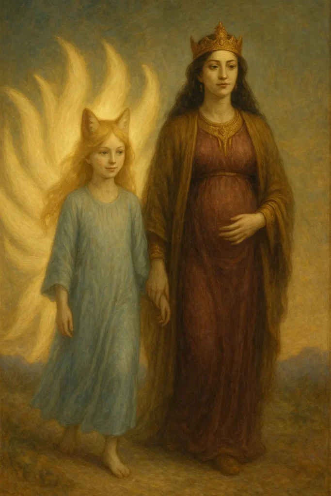 Dans les jardins élevés de Kadingirra-Ming, la lumière tombait en feuilles d’or sur les bassins d’albâtre. Kitsuné, qu’on nomme la En-Elli, marchait près de Kadingirra-Saphira, dont le souffle portait déjà le rythme d’un enfant à venir. Les lanternes inclinaient leur feu à leur passage, comme si la ville entière reconnaissait deux gardiennes du même seuil : l’une chair et sagesse, l’autre esprit et ruse lumineuse. Nulle fanfare ne troublait les terrasses ; seul le vent des hautes rues faisait frissonner les cyprès, et ce frisson disait assez la gravité des jours.