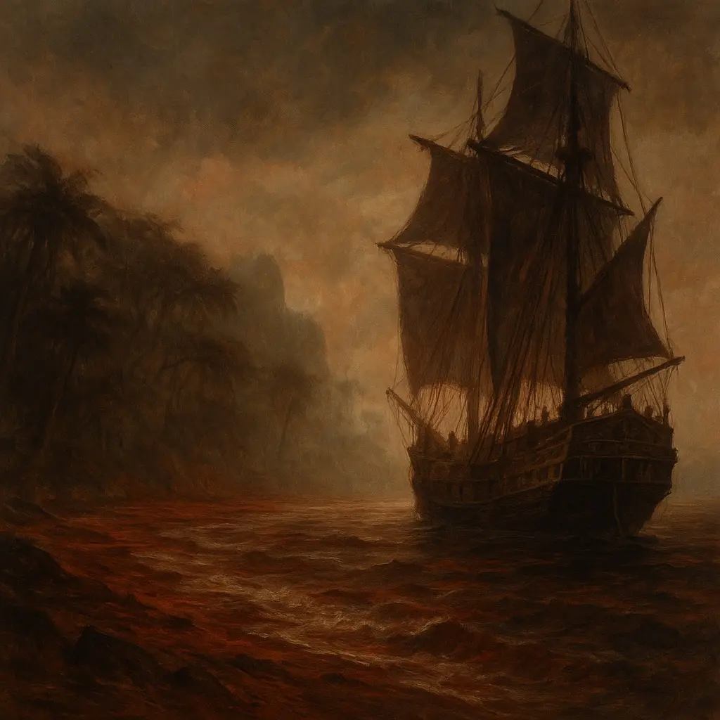 Lorsque enfin les premières formes de la côte sud-américaine émergèrent, ce ne furent pas les rivages qui frappèrent l’équipage, mais le silence. Aucun cri d’oiseau, aucune bête, aucun souffle de forêt. La ligne sombre des arbres ne bougeait pas : elle se tenait comme un mur vivant. Les troncs paraissaient déformés, inclinés, soumis à une force qui n’était pas le vent. Par endroits, la terre était rouge, presque noire, comme si la végétation avait brûlé de l’intérieur.