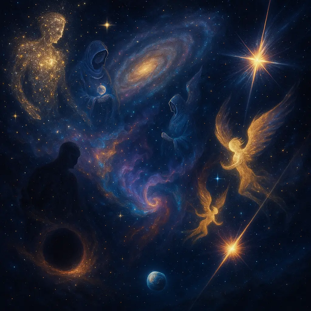 Ainsi, certains Esprits se fixèrent dans les amas stellaires. Ils glissèrent entre les nuages d’hydrogène comme des tisseurs de feu, mêlant leurs souffles à la poussière ancienne pour attiser les brasiers des étoiles en formation. Ils s’enroulaient autour des sphères incandescentes, nourrissant leurs flammes afin que la lumière ne manque jamais au vide, et que jamais l’obscurité totale ne puisse reprendre le trône dont la Flamme l’avait délogée. Leur rôle n’était pas simplement de donner naissance à la lumière, mais d’en maintenir le souffle, de veiller à ce que chaque étoile trouve sa propre cadence, sa propre voix dans le silence des abîmes.