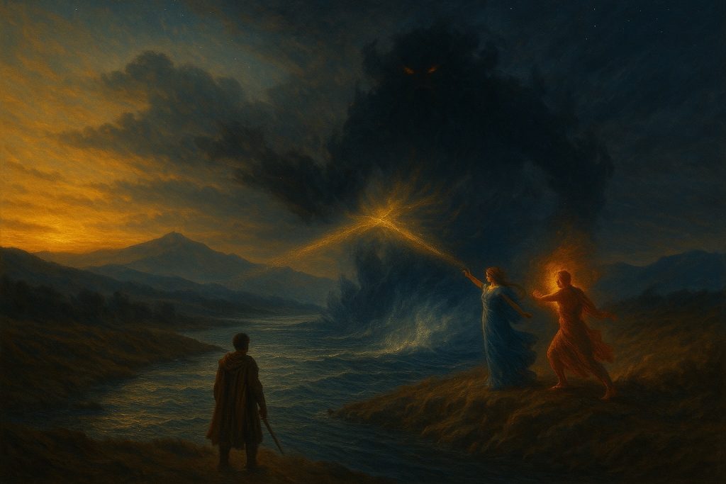 Puis le silence revint. La mer se referma, les vents revinrent à leur souffle, et la lumière du jour reprit sa place. Le Grand Roi regarda les dieux baisser la tête, épuisés, et comprit qu’ils n’avaient pas détruit l’ennemi, mais seulement retardé son éveil. Le sceau tiendrait un temps, mais d’autres failles s’ouvriraient ailleurs, là où la vigilance faiblirait. Et tandis que le soleil déclinait, il resta seul sur la rive, observant le fleuve redevenu paisible. Sur ses doigts persistait encore le goût du sel, témoin du désordre non naturel qu’il avait entrevu. Et dans la brise du soir, il sut que le monde venait de basculer.