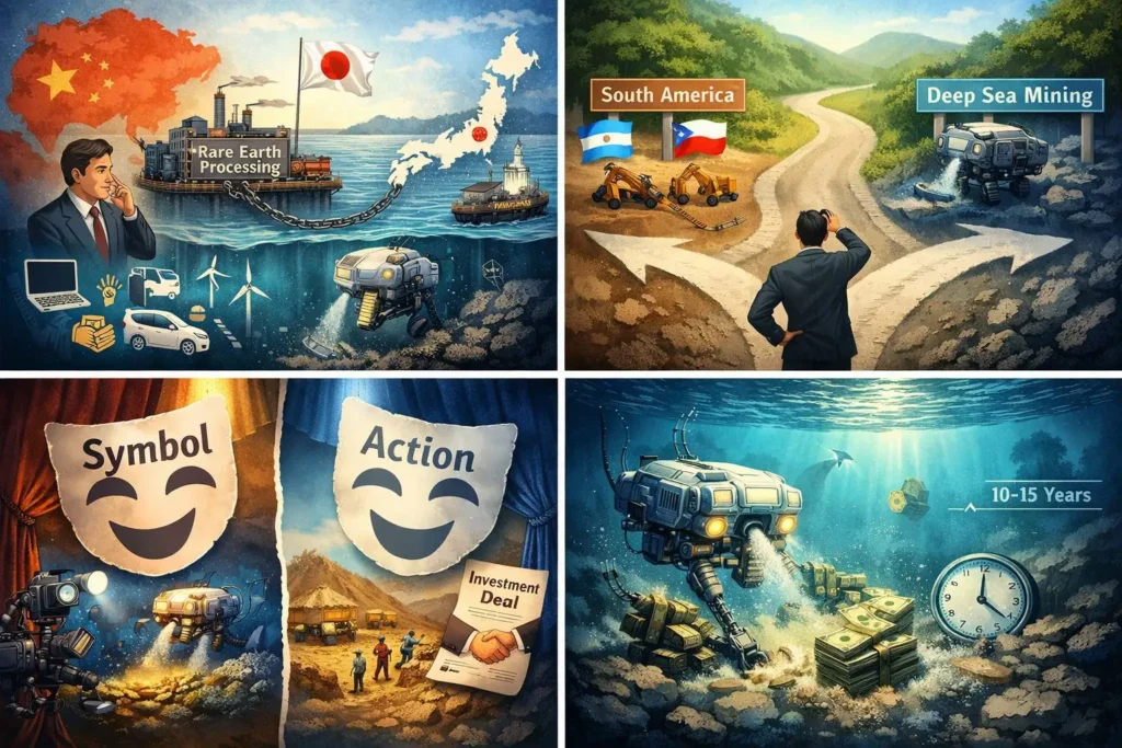 Et pourtant, le Japon n’a pas fait de ces options le cœur visible de sa stratégie. Il n’a ni mis en scène de grandes alliances minières sud-américaines, ni communiqué sur une sécurisation progressive mais réelle de ses approvisionnements. Ce silence n’est pas accidentel.